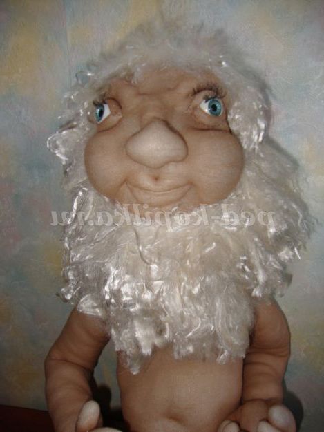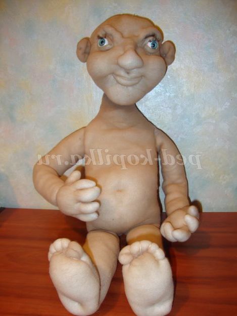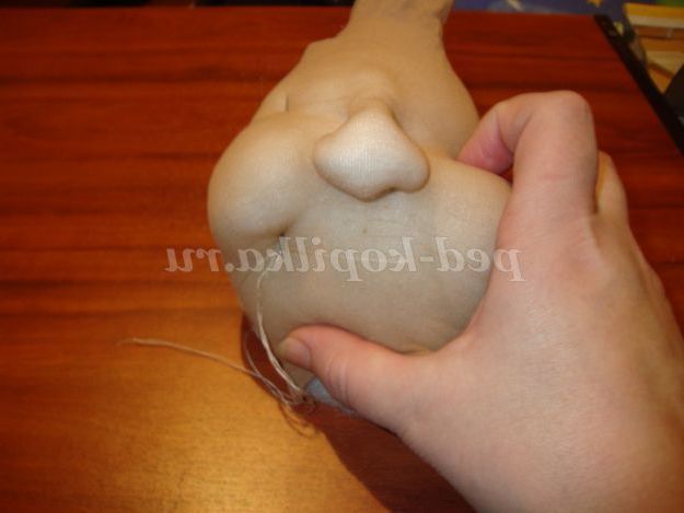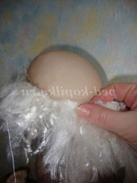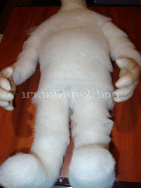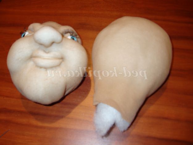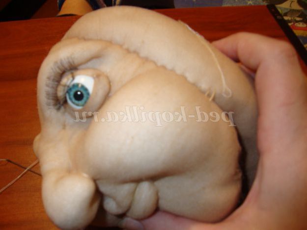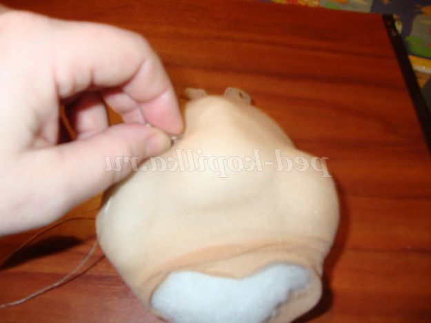 1. Відрізати 30 див. синтепону, розпушити його, надати йому форму лампочки розміром з лицьову частину голови. Пришити по контуру до лицьової частини потайним швом (фото № 10,11)