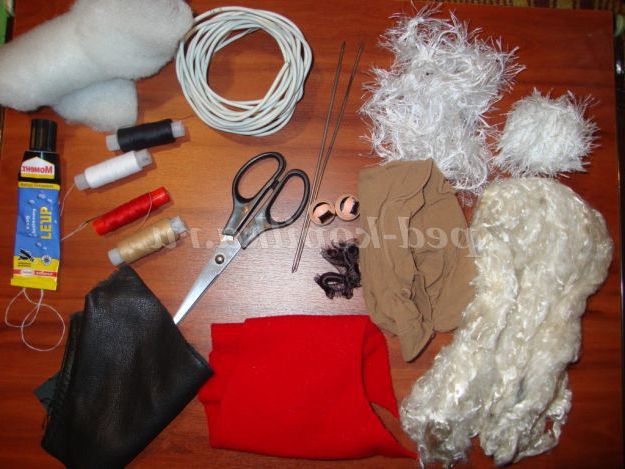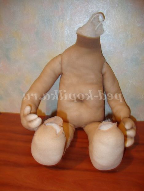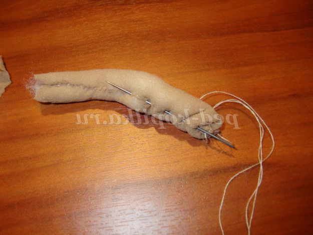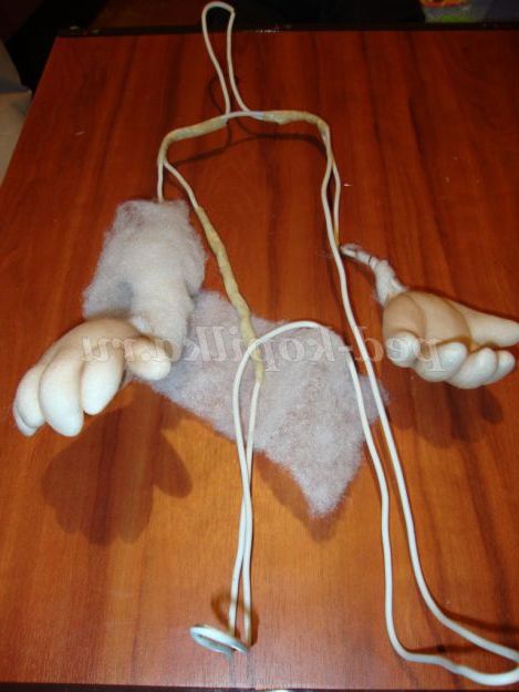 З алюмінієвого проводу з ізоляцією сформувати каркас тулуба. Обмотати каркас синтепоном як бинтом. Обшити капроном. Пришити голову до тулуба