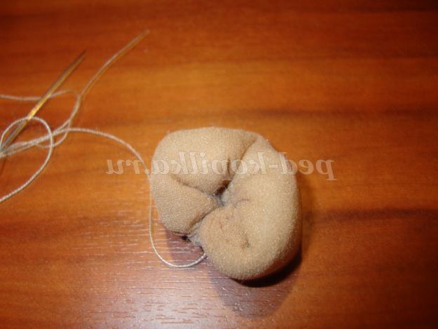 .Для вуха відрізати від колготок прямокутник зі сторонами 3 см і 8 см, скласти по ширині навпіл, вкласти синтепон і прошити край потайним швом. Потім широкими стібками зробити шов по краю і стягнути прямокутник в коло швом всередину. Пришити вийшло вухо до голови