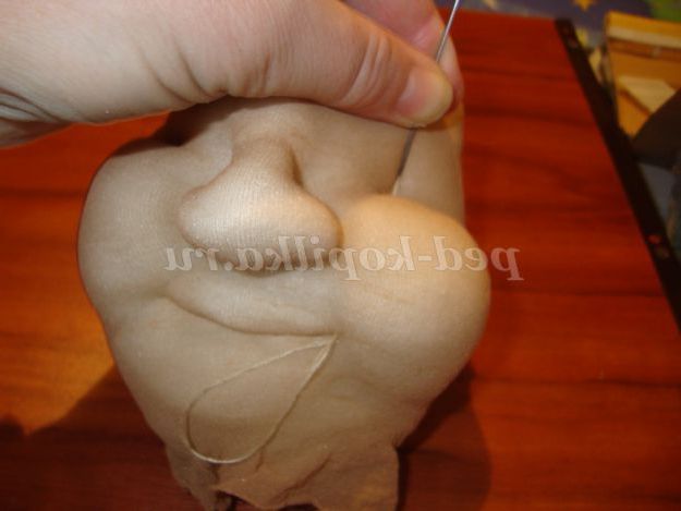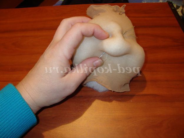 3.Губы і щоки формуються накладанням шматочків синтепону певної форми. Зсередини вироби вивести голку в лівий кут губ. Потім зробити великий стібок по довжині губ поверху вироби і вивести голку зсередини в області очниці. Зробити невеликий стібок всередину виробу і виведіть голку у верхньому куті губ. Ті ж дії виконати з лівої сторони обличчя