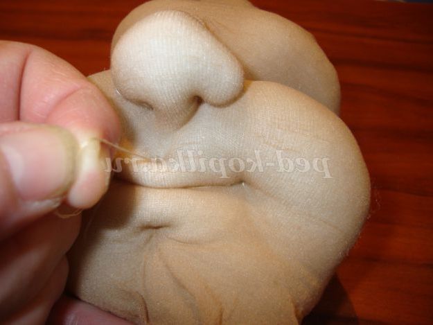 2.Сформировать з синтепону трикутник за формою носа і прикласти до кульки на те місце, де повинен бути ніс. Пришити ніс: вивести голку біля правого краю перенісся, зробити невеликий стібок і вивести голку у лівій ніздрі. Знову зробити невеликий стібок і вивести голку біля правого краю перенісся. Ці дії повторити 2 - 3 рази. Потім з правого краю перенісся вивести голку на лівий край перенісся паралельно правому краю. Ті ж кроки виконати з лівого боку на праву