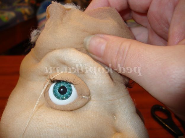 5.Для століття відрізати від колготок прямокутники зі сторонами 2 см і 6 див. Зігнути навпіл по ширині, всередину покласти тонкий шар синтепону, прошити короткими стібками. Одержаний джгутик зшити в кільце. В кільце готовий вкласти очей і по контуру пришити до очниці. Приклеїти вії