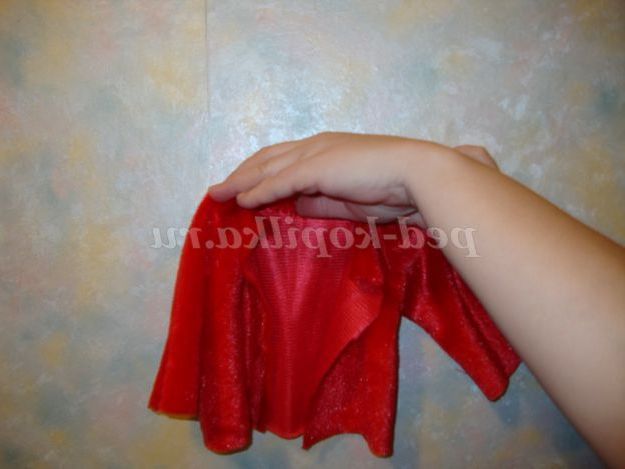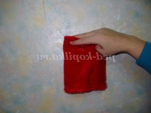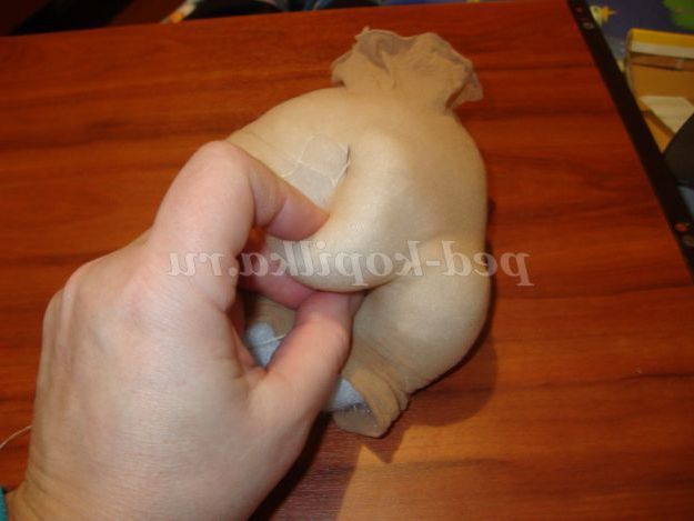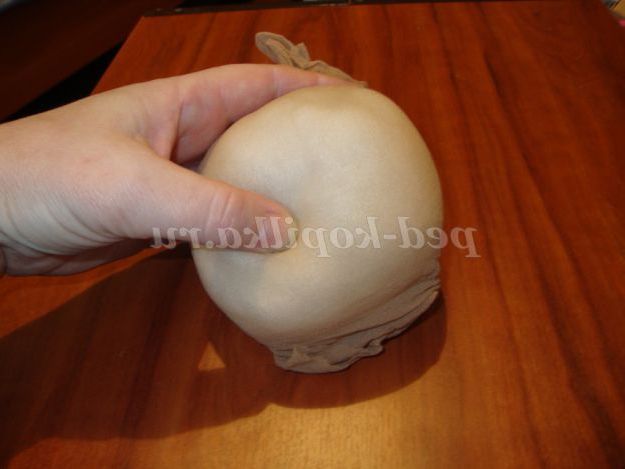 1.Отрезать від синтепону квадрат розміром сторони 30 див. Розпушити синтепон і згорнути його в кульку. Відрізати 20 см. від колготок і готовий кульку з синтепону вкласти всередину