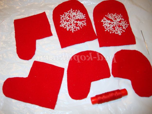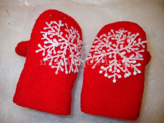 Рукавиці викроїти з тканини червоного кольору, прикрасити сніжинкою