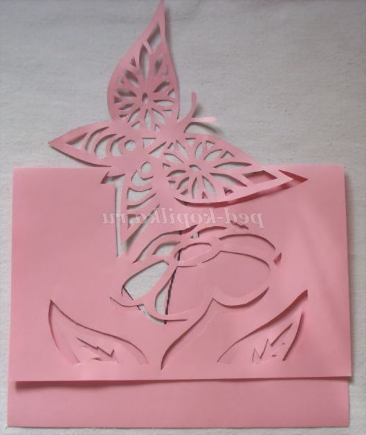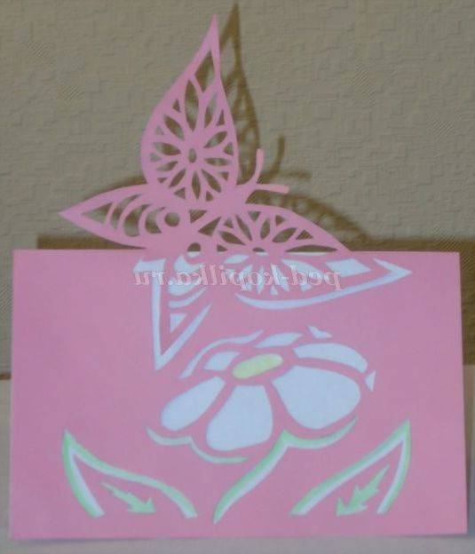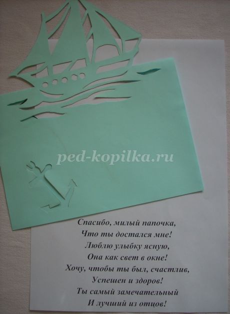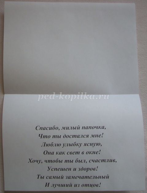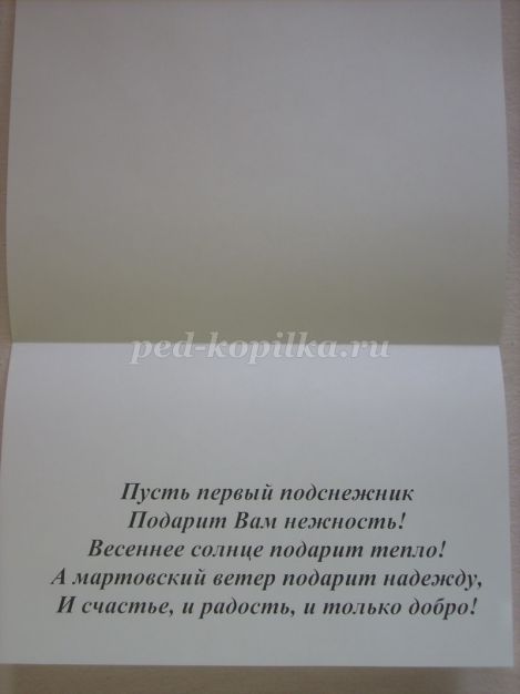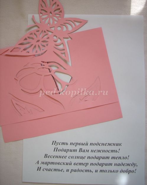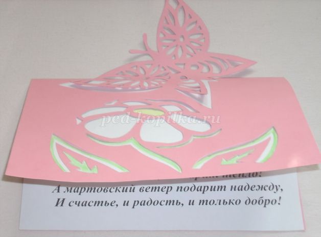 8.Вклеиваем аркуш з віршем в основу з вирізаною метеликом. Деякі вирізані елементи листівки можна малювати фломастерами або олівцями. Краї листівки можна оформити ножицями з фігурними лезами.