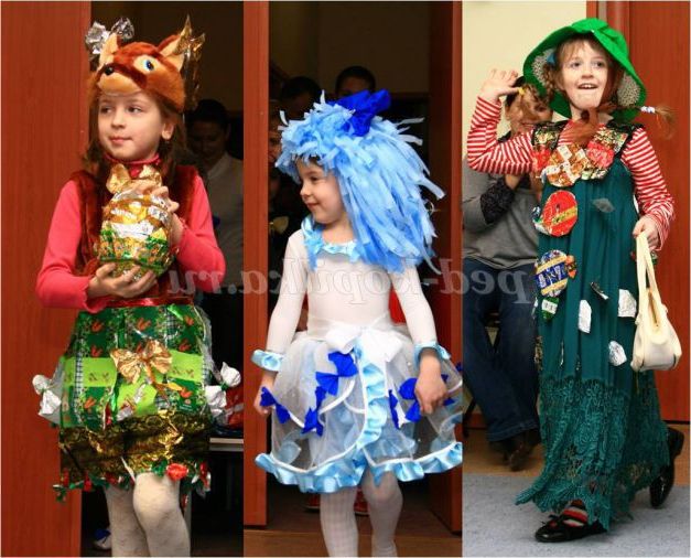 На сцені залишаються 3 конкурсанта. Інші учасники сідають на лавки. По черзі дітям пропонується розповісти, з чого зроблений їхній костюм: з фантиків, з гофрованого паперу, фольги і т.д. Потім запрошуються батьки цих дітей. Проводиться змагання.