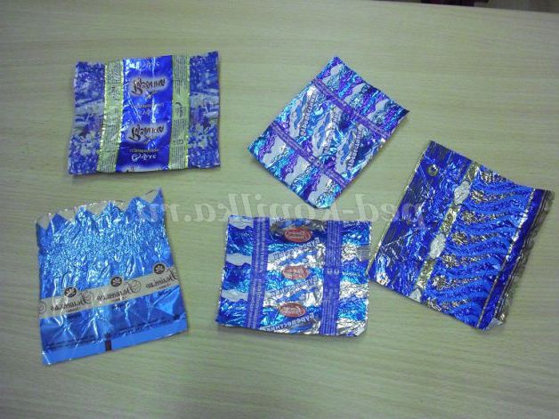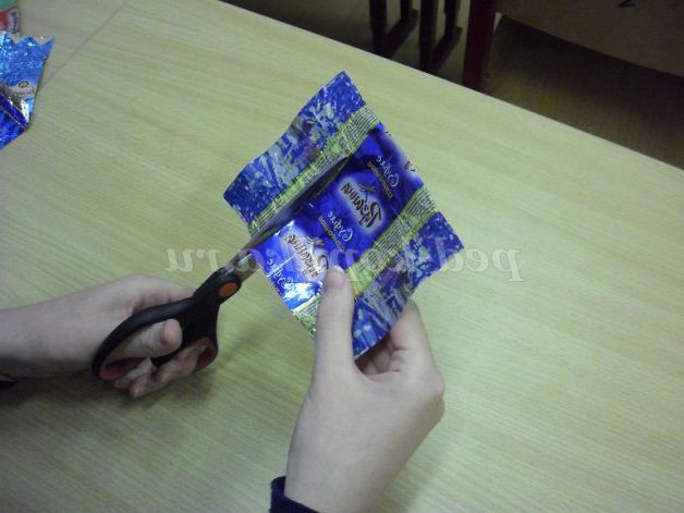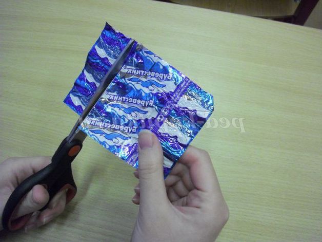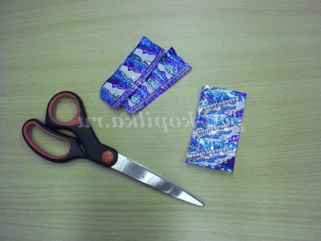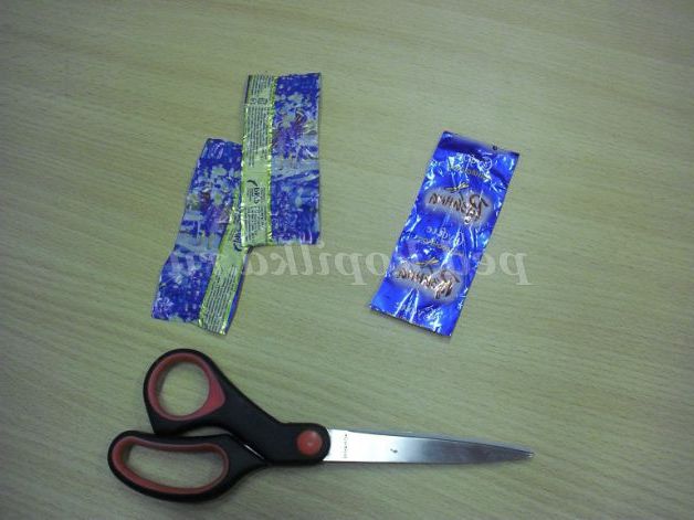 Беремо фантики з-під цукерок "Рузана" і також відрізаємо краю з двох сторін.