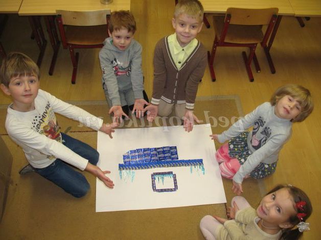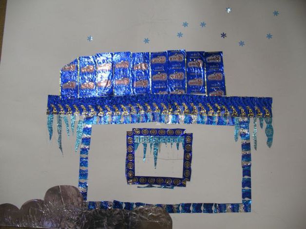 На білому ватмані від руки малюємо образ хатинки. Підбираємо потрібні фантики. Фантики повинні бути синіх і блакитних відтінків.