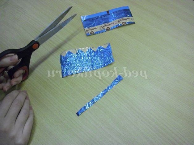 А ось бурульки ми вирізаємо з фантиків блакитних відтінків. Нарізаємо тонкі смужки, і наші бурульки готові!
