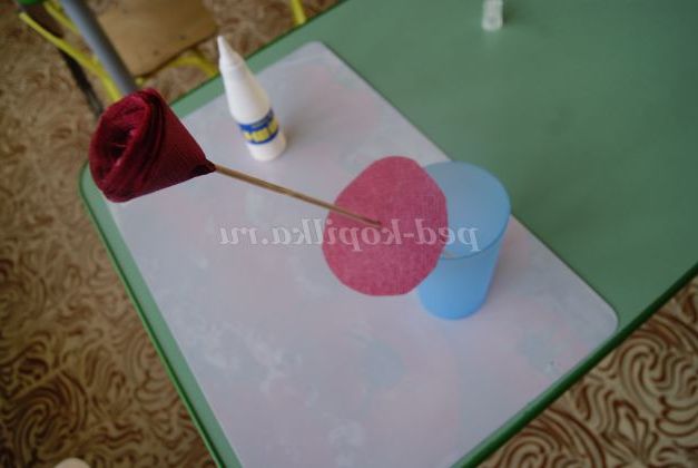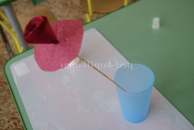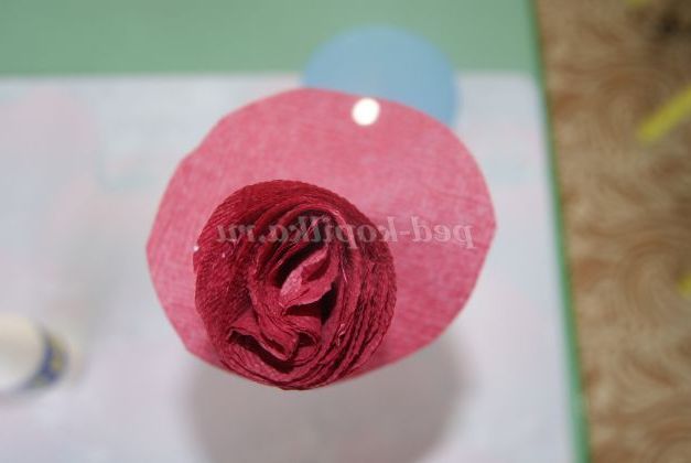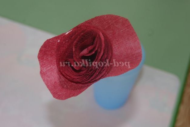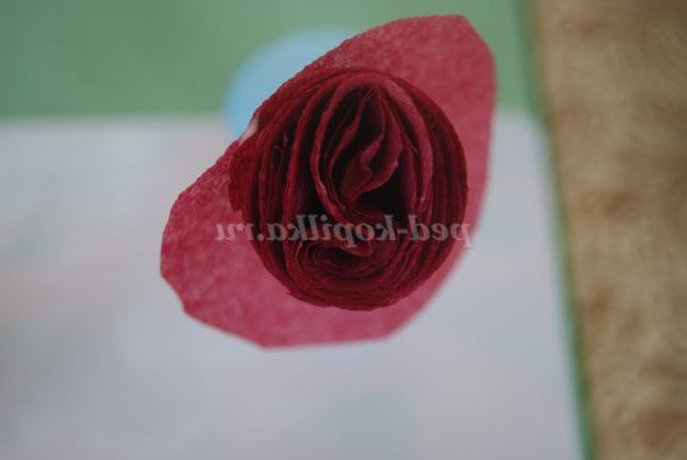6. Приклейте кола, формуючи пелюстки троянди. Готову троянду ставимо в стаканчик для того, щоб висох клей. Лежачи троянду сушити не можна, вона деформується.