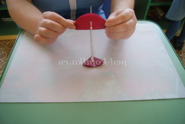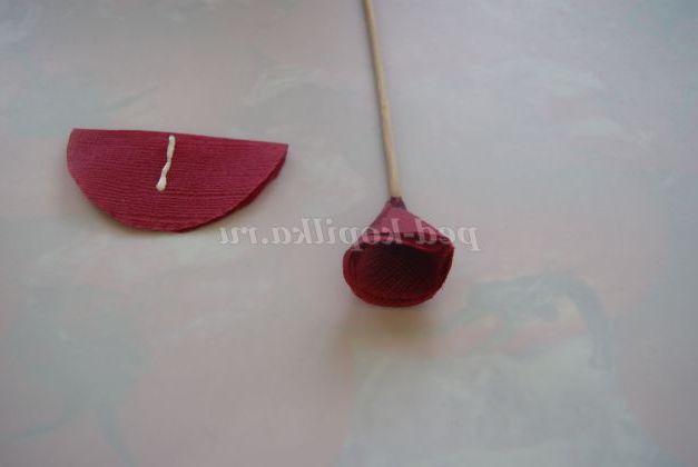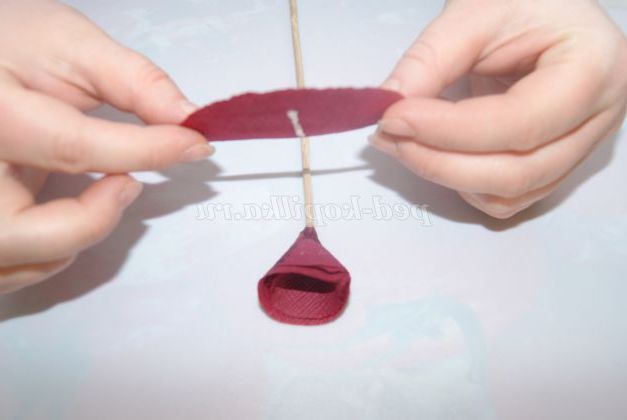 5. Візьміть 2-4 кола, зробіть по центру дірочки гострим кінчиком шпажки і просмикніть в них стеблинка. Підтягуємо коло до бутончика.