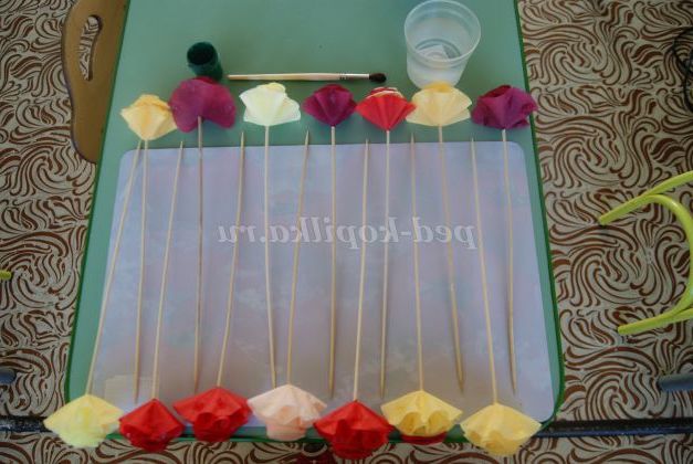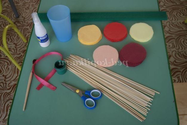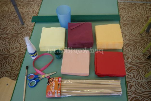 Серветки паперові різнокольорові, ножиці, клей ПВА, дерев'яні шпажки, зелена гуаш, зелена гофрований папір, вазочка для установки букета, стрічка атласна шириною 1 див.