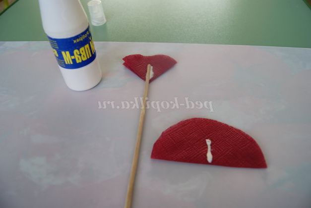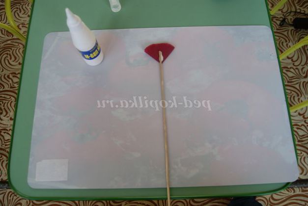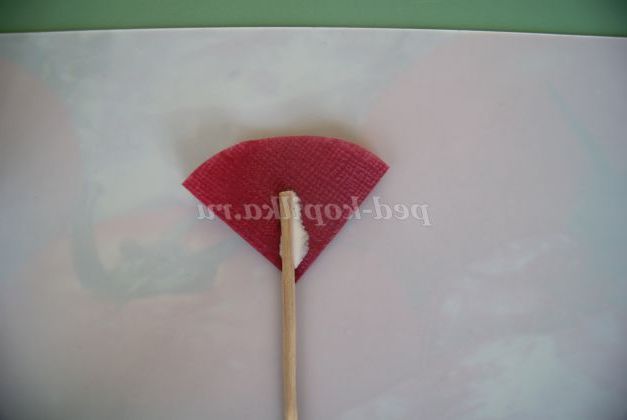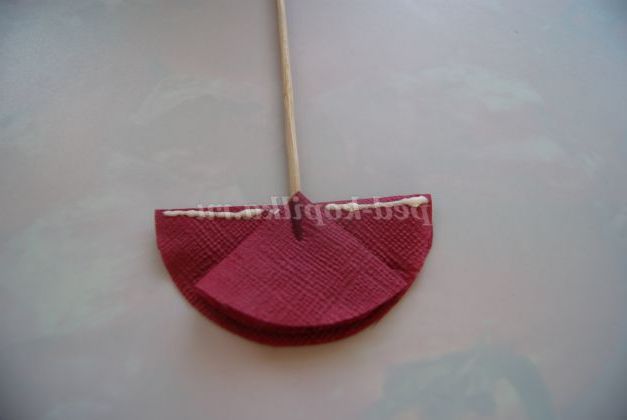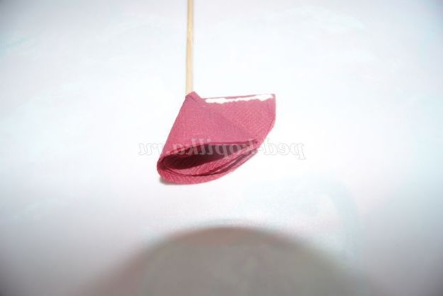 2. Починаємо формувати квітка. Візьміть 1 коло і двічі складіть його навпіл. Змастіть клеєм серединку, на клей покладіть стебло-шпажку і на стебло покладіть ще одну складену серветку навпіл.