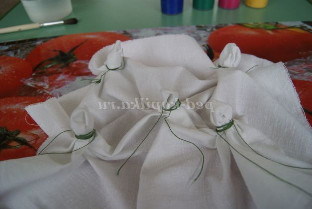 2. Для того що б зробити вузлик беремо тканину дрібкою і туго перетягуємо ниткою в кілька витків, зав'язувати вузол не треба (потім знімати нитка буде не зручно). Кількість вузликів залежить від вашого бажання.