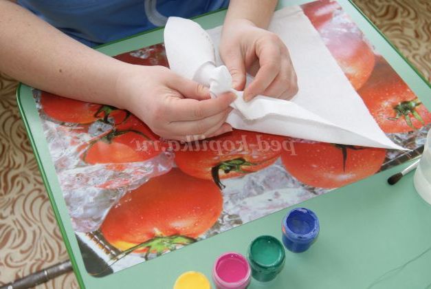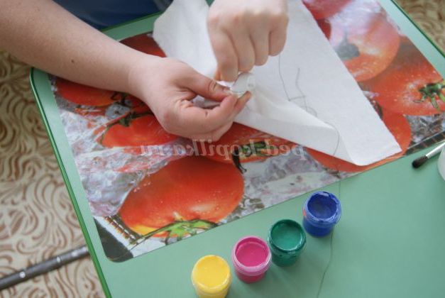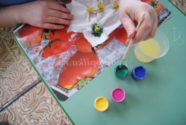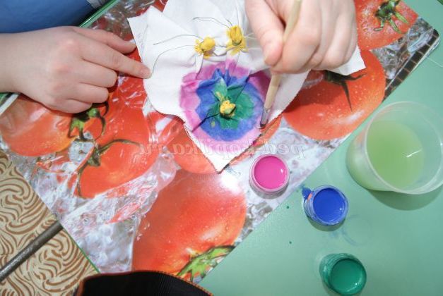 3. Починаємо розпис. Розфарбовуємо спочатку вузлик. Пензлик і тканина мочимо водою якомога більше, від цього залежить розтікання фарби і, як наслідок, краса закінченої роботи.