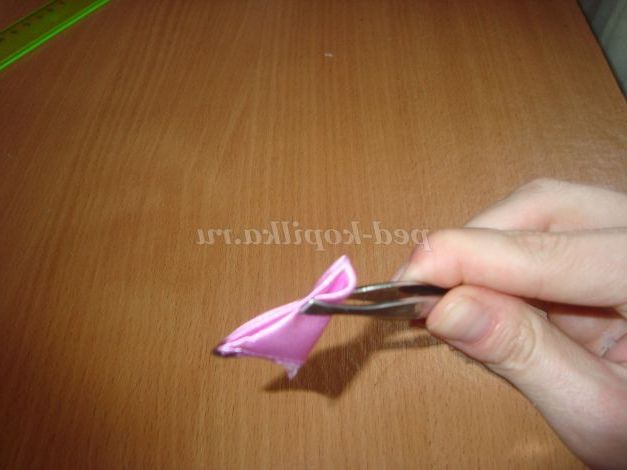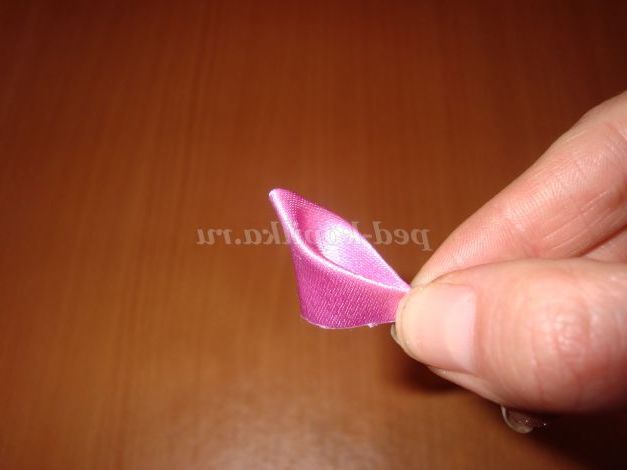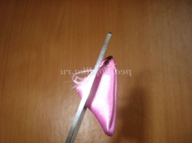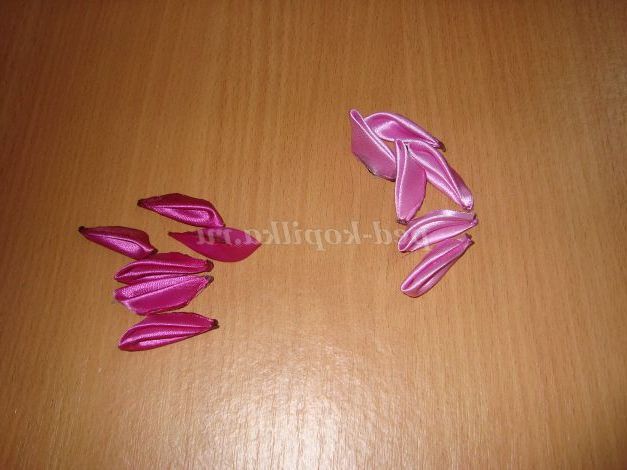 15)Аналогічним чином робимо пелюстки з стрічки малинового кольору 6 штук