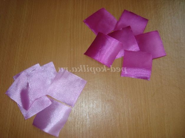 3) Беремо стрічку рожевого і малинового кольорів і нарізаємо по 6 квадратів зі стороною 5 сантиметрів кожного кольору