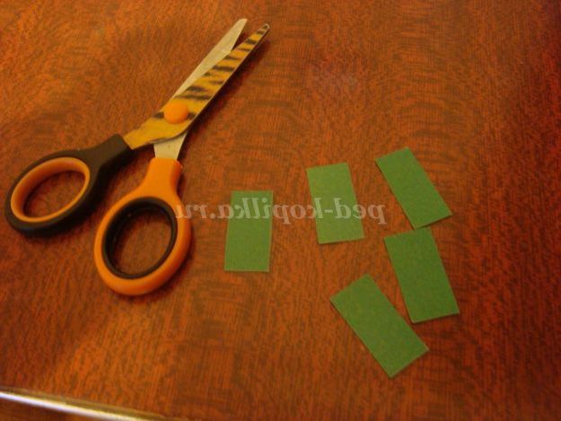 Вирізаємо з кольорового паперу зеленого кольору прямокутники розміром 1,5см*3 см 5-6 штук.