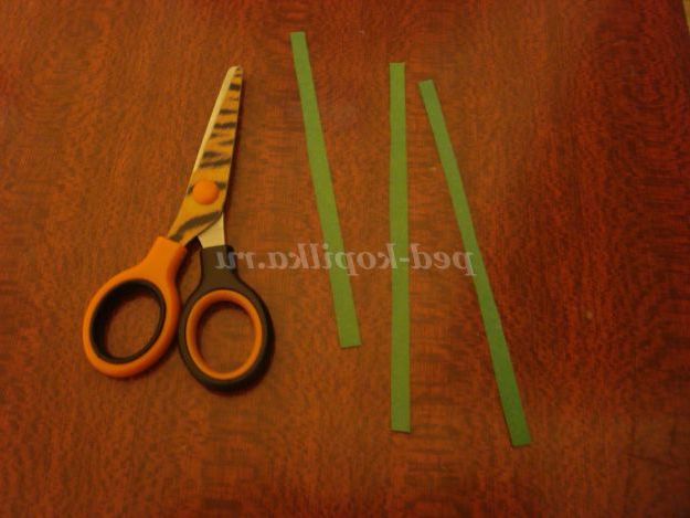 Для букета не вистачає листочків і стеблинок. З кольорового паперу зеленого кольору вирізаємо стеблинки-вузенькі смужки довільної довжини. Після примірки можна буде підрізати довжину стеблинок.