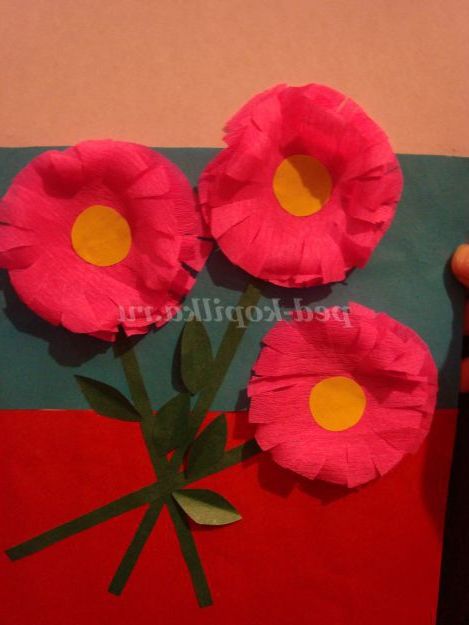 З паперу жовтого кольору вирізаємо серединку для цветочков.Три квіточки-три серединки. І приклеюємо їх у центр. Наші квіточки готові.