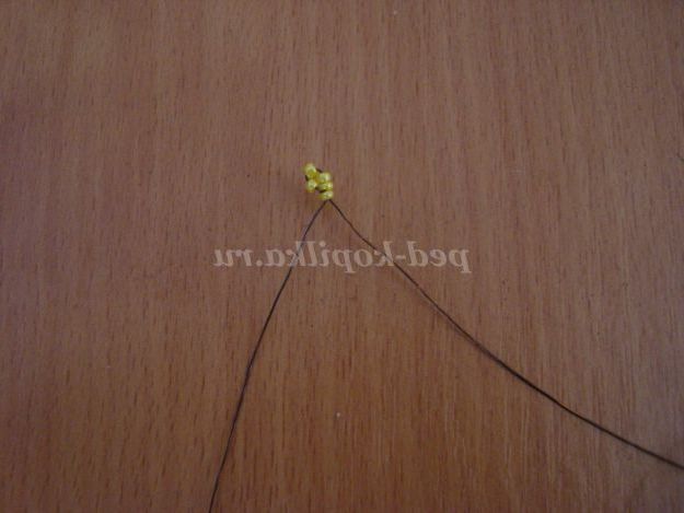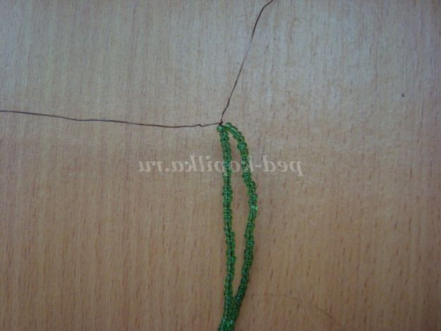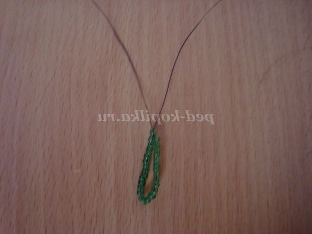 23) Набираємо 4 см бісер і з'єднуємо посередині дроту, де набраний бісер. Знову набираємо бісер, десь 3 см і пропускаємо посередині цієї петли.Скручиваем знизу.