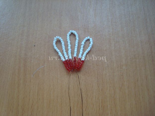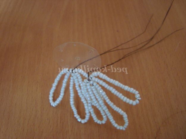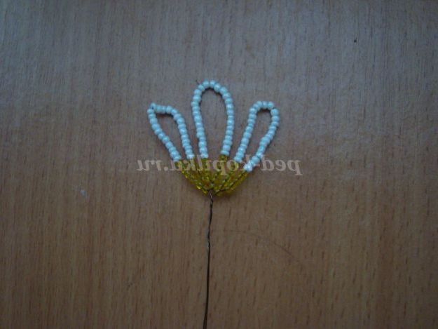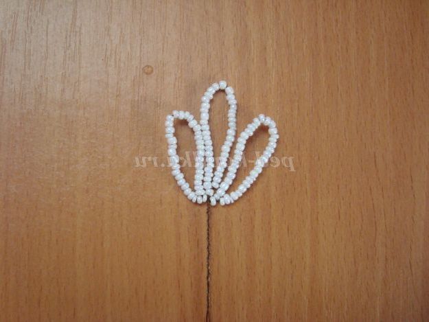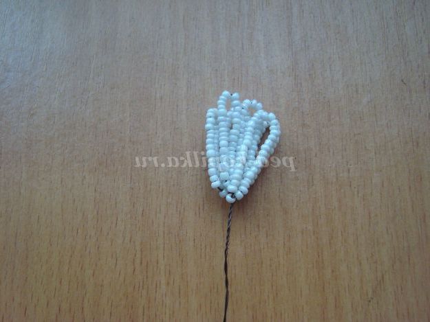 14) Займемося бутонами. Для цього набираємо на дріт білий бісер довжиною 5 см і робимо петельку.Таких петельок робимо 6 штук