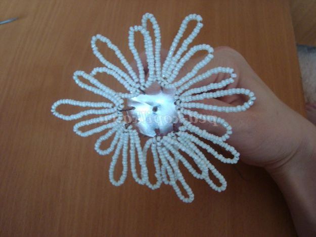 5)Далі робимо серединку. Вона складається з таких же петельок, як і пелюстки. П'ять петельок по 5 бісерін кожна, скручуємо в кульку.