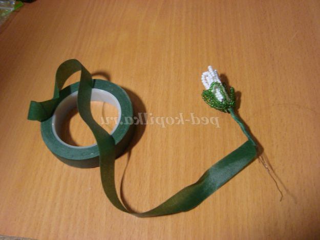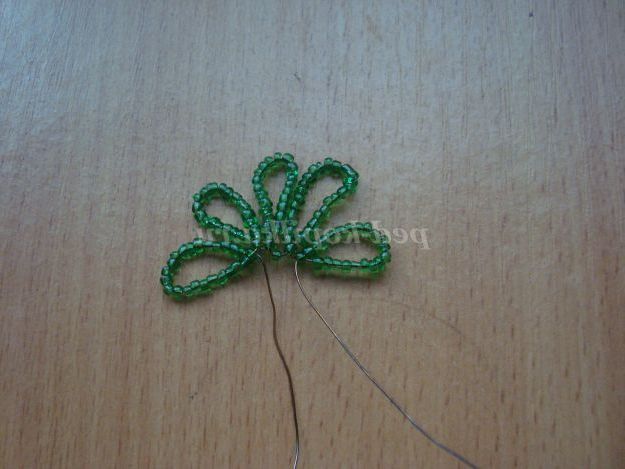 7) Для чашолистка набираємо на дріт зелений бісер довжиною 6 див. Робочим кінцем дроту входимо назад в першу бісеринку, виходить петелька, таких петельок робимо 8 .