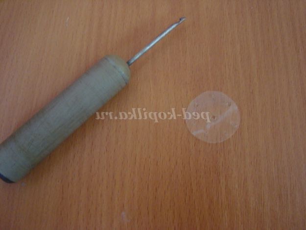 10) Шилом в пластиковому колі робимо дірочки-одна в центрі і сім по краю.