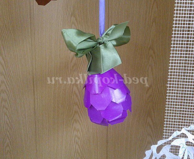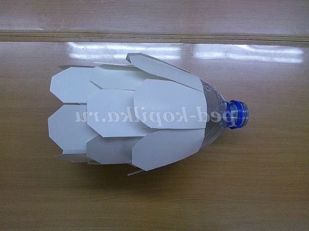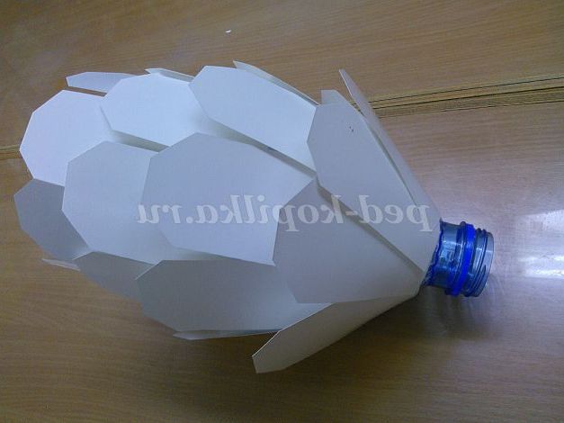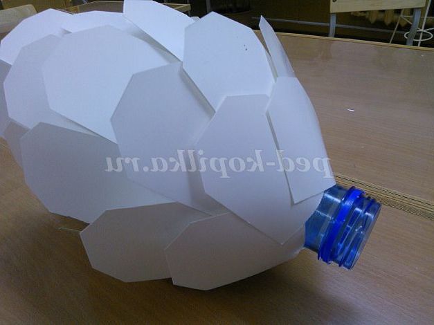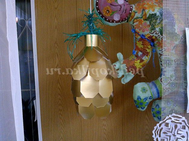 Цей майстер-клас я використовувала на заняттях моєї ізостудії. Мелованый картон замінила на глянсову кольоровий папір. Клей Момент на клей ПВА і олівець. За основу ми взяли пляшку 1.5 літра, третю частину, розмір лусочок, приблизно, 4*5.5, 4*6. Прикрашали атласними стрічками, закріплювали всередині на зубочистки. З даної виробом впоралися діти від 6 до 11 років, тільки дошкільників та молодшого шкільного віку (7-8) необхідна допомога в підготовці лусочок, у кріпленні та оздобленні шнура.