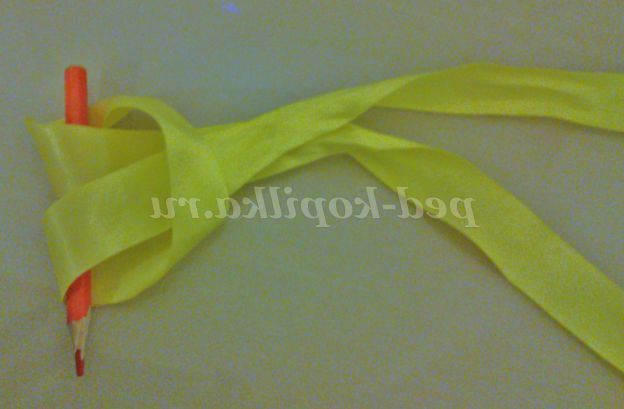 Беремо коротку паличку ( близько 8 см), я використовувала сточеные олівці, прив'язуємо до них, залежно від оформлення, шнур або атласну стрічку (1 - 2 см). Просунем олівець в шийку і зафіксуємо його всередині за допомогою клейового пістолета.
