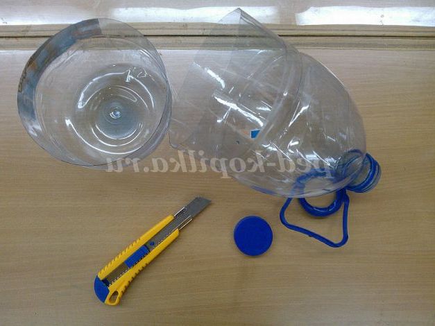 Готуємо пляшку до роботи. Розрізаємо її, за допомогою різака, по колу трохи нижче середини. Нам знадобиться верхня частина бутылки.Удаляем з горлечка фіксатор кришки.