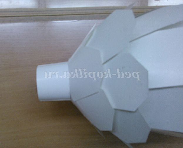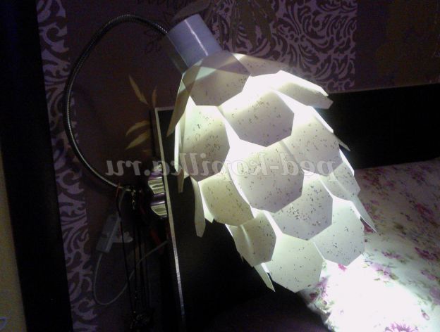 Спочатку воно задумано як плафон. Передбачалося, що кілька шишок-плафонів будуть висіти в ряд на довгих білих електричних шнурах у фойє, де стоїть святкова ялинка (прикрашена іграшками у вигляді шишок) Всередину горлечка зміцнюється патрон лампи не більше 15 ват або світлодіодна лампа. На даному фото представлений варіант розташування плафона на прикроватном світлодіодному світильнику.