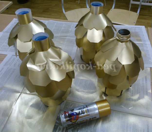 На жаль, обставини не дозволили втілити ідею в повному обсязі. Тому педлагаю інший варіант використання шишки-плафона. Фарбуємо готові шишки аерозольною фарбою, в даному випадку золотий, зовні і всередині.