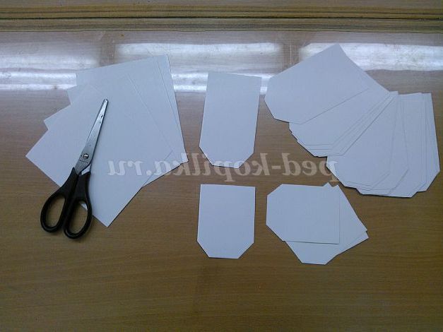 Готуємо крейдований картон. Для лусочок шишки, я підбирала розмір карток на око. Приблизно кожна вийшла 12*6,5. Для останнього ряду 8*6,5. На одну шишку знадобиться 32 довгих картки і 6 коротких. У кожного прямокутника потрібно відрізати два нижніх кута. Можна закруглити.