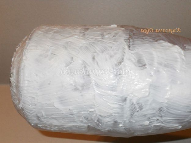 Наступне наше дію з імітувати шкуру, її шорсткості і напрямок дрібних волосков.Для цього накладаємо на банку купку шпаклівки і жорсткої пензлем робимо мазки за напрямом вниз.Должны з'явитися дрібні подряпини .