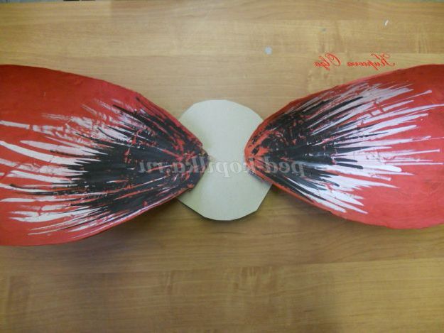 З картонки (можна взяти коробочку від клею)вирізаємо коло діаметром близько 10 см. і приклеюємо один на проти одного два пелюстки за допомогою клейового пістолета.