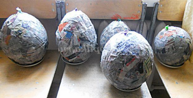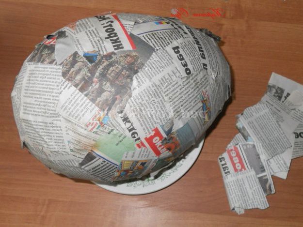 Вмочуємо газету в клеї і обкладаємо кулька в декілька шарів,не менше 4 шарів.