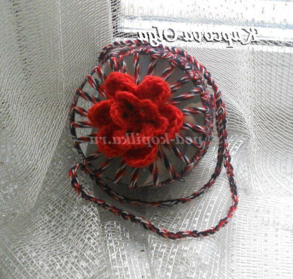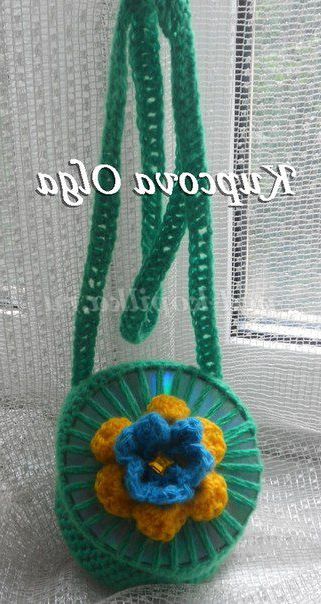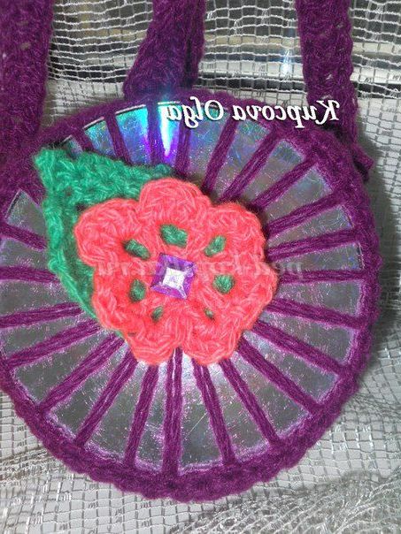 Сумочку можна прикрасити будь-якими декоративними гудзиками,стразами,маленькою іграшкою. Якщо Ви будете прикрашати сумочку,як я-в'язаним квіткою,то це треба буде зробити до з'єднання двох деталей дисків( так зручніше закріпити в'язаний елемент)
