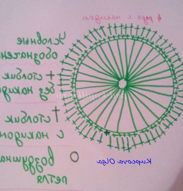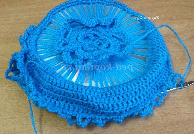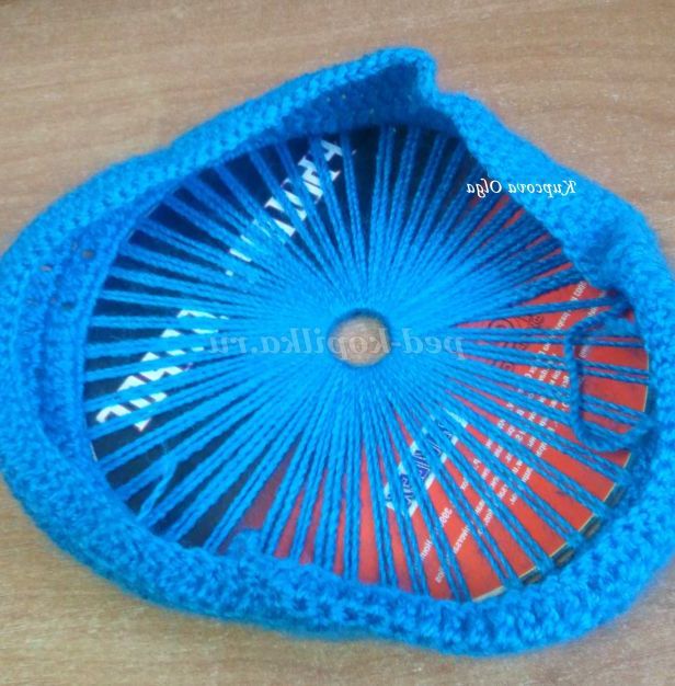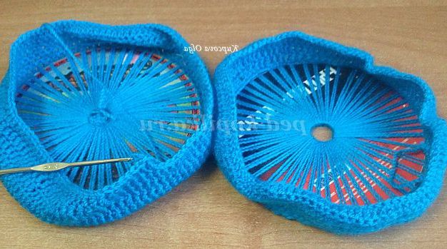 Після того,як наш перший ряд петель без накиду з'єднався,робимо три (3) повітряних петлі на підйом. Обв'язуємо диск по всьому периметру стовпчиками з накидом (кількість петель у всіх буде різне тому що товщина нитки і гачка має велике значення)Стовпчиком з накидом в'яжемо стінки близько 4 рядів.