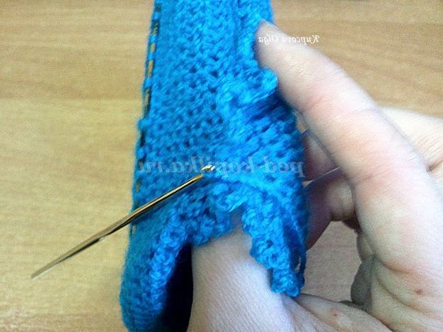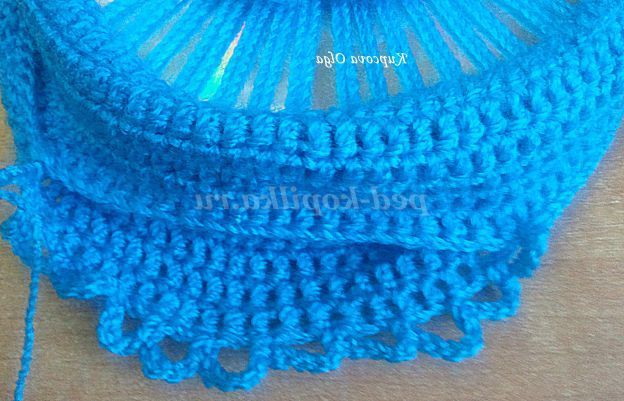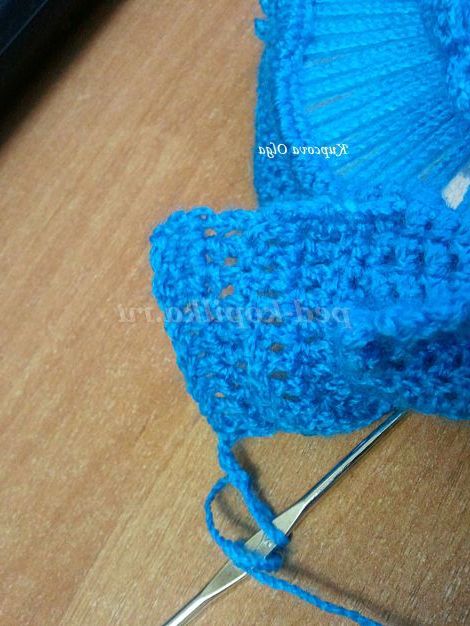набираємо п'ять(5) повітряних петель,пров'язуємо через одну,знову п'ять(5) повітряних і так по всьому периметру нашого отвори для рук.