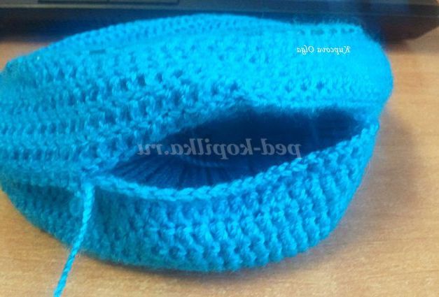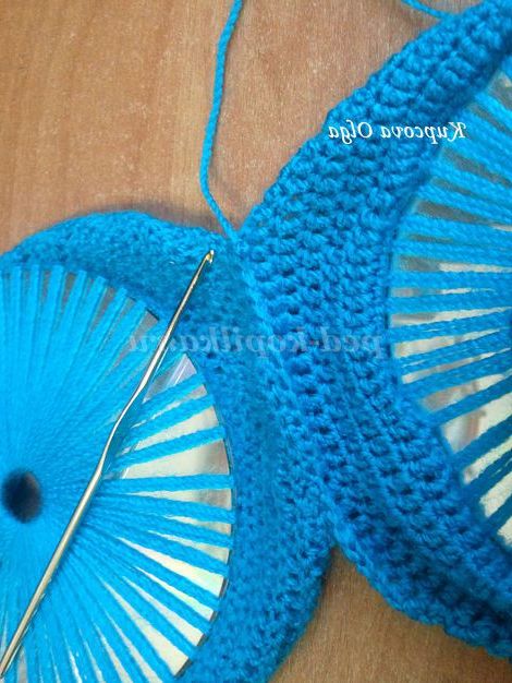Тепер не обрізаючи нитка у другого диска починаємо поєднувати обидві половинки пров'язуючи ряд без накиду чіпляючи петлі крайніх рядів.
