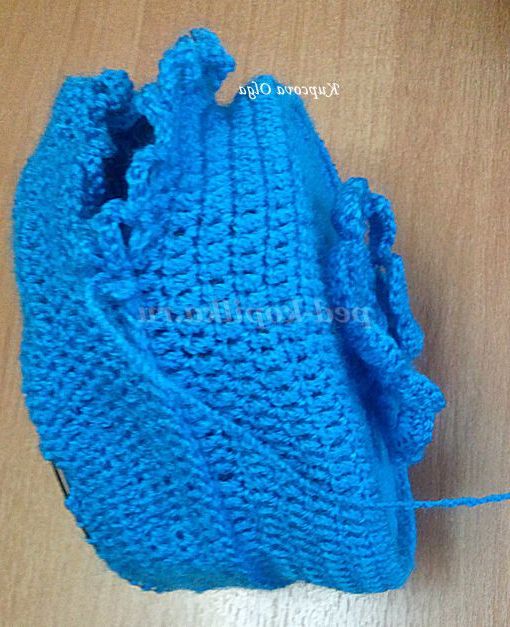 Тепер сміливо починаємо в'язати ручку сумки стовпчиками з накидом,не забуваючи при розвороті робити три (3) петлі на підйом.