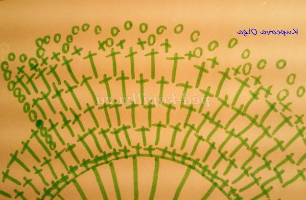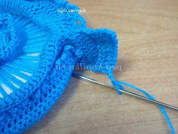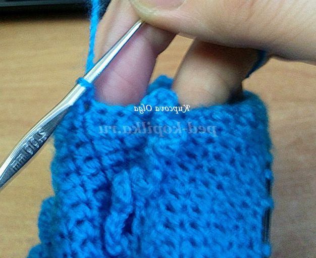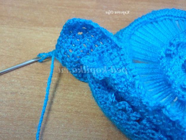 Від останньої закріпленої повітряної арки пров'язуємо в бік п'ять(5) петель без накиду,одну(1) петлю на підйом,розвертаємося і пров'язуємо десять(10) петель,так щоб з кожного боку від повітряних рюшек у нас вийшло однакову відстань.