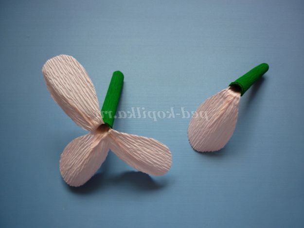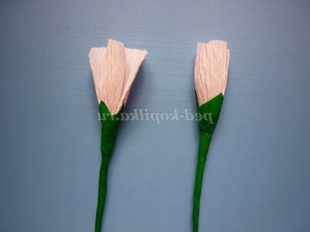 До квіткам приєднуємо великі бутони, закріплюємо внизу папером. Згинаємо стеблинки квіток і бутонів, щоб квіти та бутони дивилися вниз.