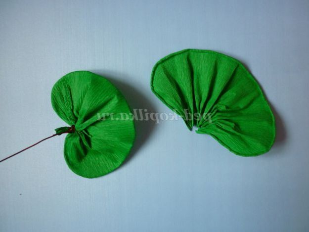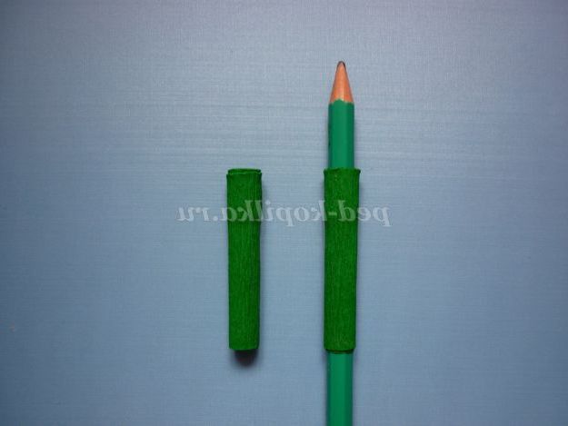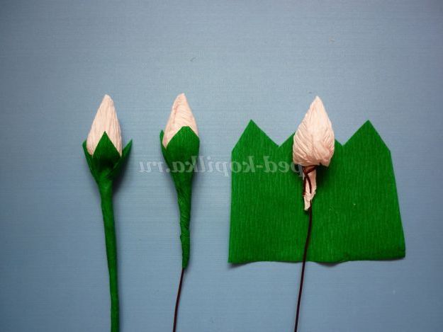 По шаблону з зеленого паперу вирізаємо заготовку, кладемо на середину бутон і обертаємо його, скручуючи папір навколо дроту.