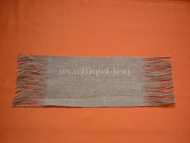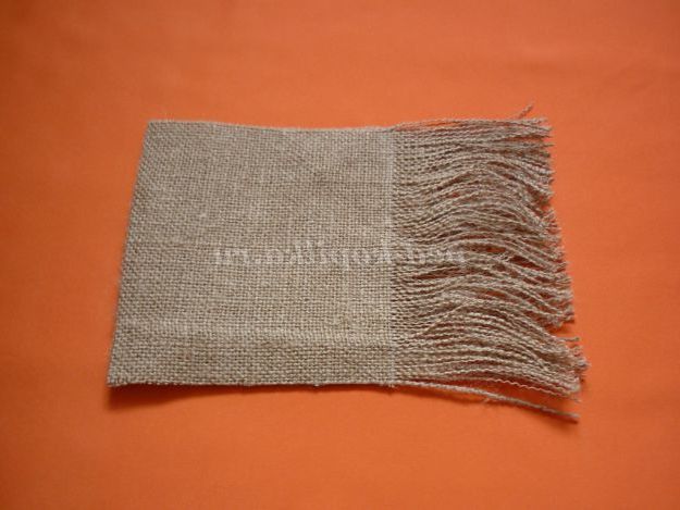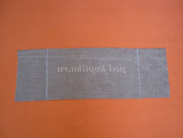 Візьміть шматочок мішковини розміром 16/50 см, добре отпарьте мішковину праскою. На відстані 10 см від кожного краю прочертите крейдою лінію.