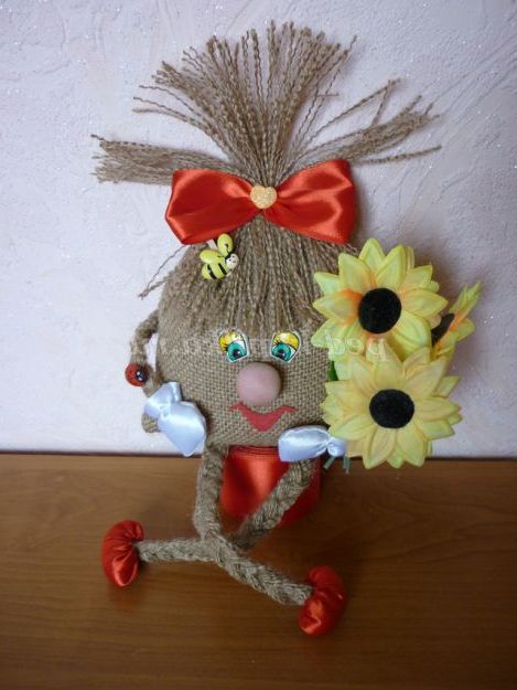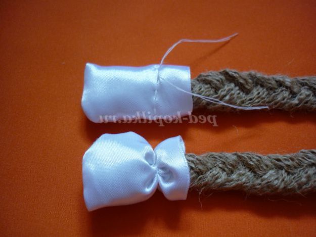 Шматочок мішковини 25/16 розпустіть на окремі ниточки. З довгих ниток робимо ніжки, а з коротких - руки. Робимо два пучки по 45 ниток для ніг і два пучки по 45 ниток для рук. Заплітаємо косички.
