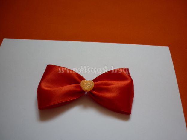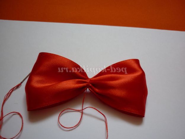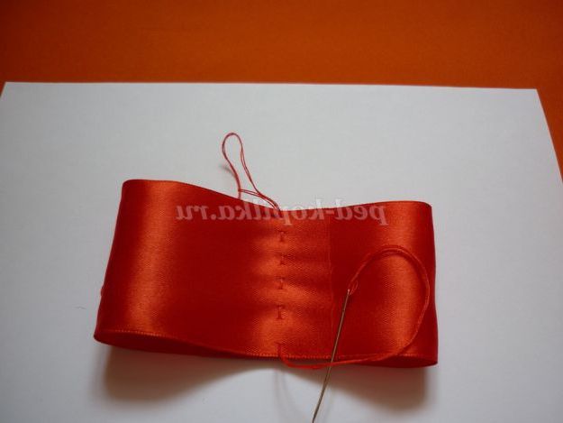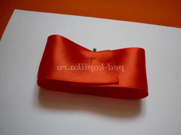 Візьміть червону атласну стрічку 25см. Складіть її як показано на фотографії.
