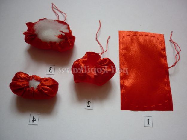 Робимо черевички. Відріжте 2 шматочки червоної стрічки по 9см. По всьому периметру стрічок зробіть стібки, акуратно стягаючи, наповніть синтепоном. Сформуйте черевичок і закріпіть нитку.
